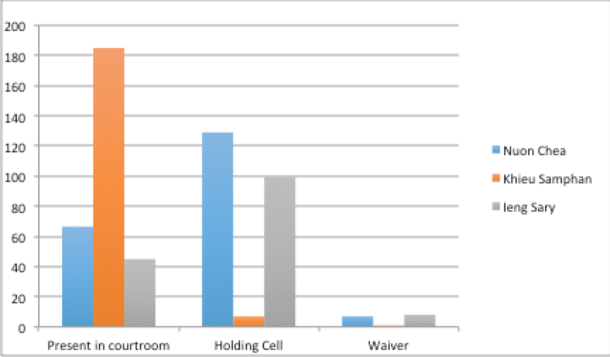 [1] Article 35 of ECCC law establish new (d) and Internal Rules IR 81 (1). See also Art. 14.3 (d) of the International Covenant on Civil and Political Rights states that everyone is entitled “to be tried in his presence, and to defend himself in person or through legal assistance of his own choosing….” [2] Cambodian Constitution (1993), Art. 31. [3] ECCC Internal Rules (IR), Rule 81. [4] IR 81 (5) provides: Where, due to health reasons or other serious concerns, the Accused cannot attend in person before the Chamber but is otherwise physically and mentally fit to participate, the Chamber may either continue the proceedings in the Accused’s absence with his or her consent or, where the Accused’s absence reaches a level that causes substantial delay and, where the interest of justice so require, order that the Accused’s participation before the Chamber shall be by appropriate audio-visual means. In such cases, the Accused may be defended during the proceedings by his or her lawyer. Where the Accused refused to choose a lawyer, the Chamber shall order that the Accused be represented by a lawyer and request the Defence Support Section to assign him or her a lawyer, from the lists mentioned at Rule 11. [5] Initial hearing Transcript, E1/4.1 (27 June 2011). P. 75, line 1-20. [6] Hearing on Evidence Transcript, E1/160.1 (14 January 2013). P. 4-5, line 11-14 and P. 9, line 7-8. [7] See AIJI. KRT Trial Monitor case 002 Issue No. 23. Hearing on Evidence, Week 18 (18-21, 23 May 2012). 3-4. See [8] Hearing on Evidence Transcript, E1/49.1 (15 March 2012). P. 128, line 12-16. Also see AIJI. KRT Trial Monitor Case 002 Issue No. 14, week 9 (Hearing on Evidence, 12-15 March 2012). P.3. [9] See AIJI. KRT Trial Monitor Case 002 Issue No. 32. Hearing on Evidence, Week 31 (20-21 September 2012). 4-5. [10] Hearing on Evidence Transcript, E1/49.1 (15 March 2012). P. 71, line 12-22. Also see AIJI. KRT Trial Monitor Case 002 Issue No. 14, week 9 (Hearing on Evidence, 12-15 March 2012). P.3. [11] Hearing on Evidence Transcript, E1/49.1 (15 March 2012). P. 61, line 2-11. Also see AIJI. KRT Trial Monitor Case 002 Issue No. 14, week 9 (Hearing on Evidence, 12-15 March 2012). P.2. [12] See ECCC Transcript of Preliminary Hearing on Fitness to Stand Trial, E1/10.1 (31 August 2011), p. 42, line 27-5. See also ECCC Transcript E1/10.1 (31 August 2011), p. 43, Line 10-11. See also AIJI. KRT Trial Monitor Case 002 Issue No. 2 (Fitness to Stand Trial, 29-31 August 2011). P.4.