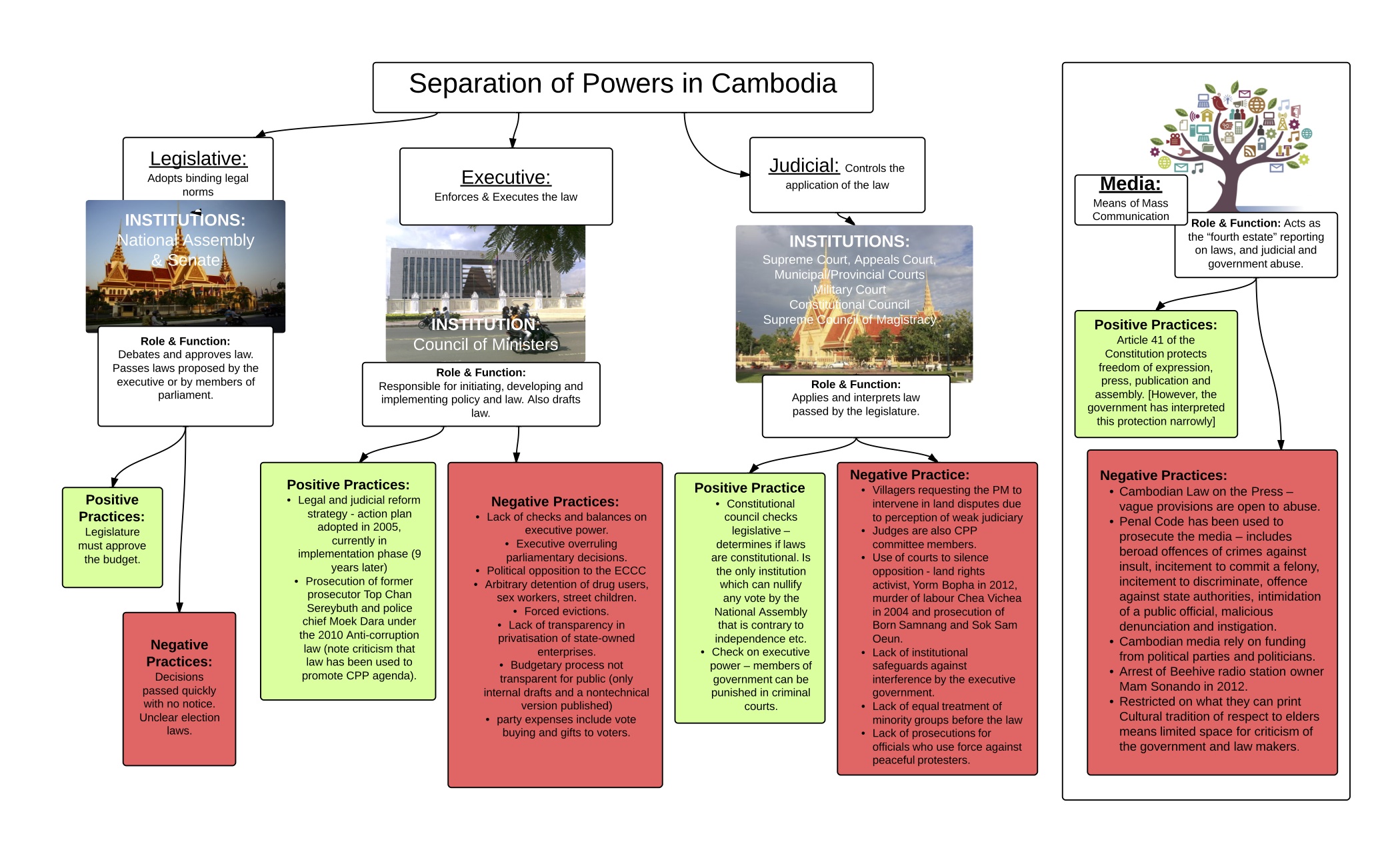 Article 51 of the Cambodian Constitution holds that the legislative, executive, and judicial powers in Cambodia shall be separate. In theory, this separation of powers is intended to place checks and balances on the different branches of government, separating the areas of responsibility and governance in order to minimize the power of any one branch. Additionally, mass media is often included as the “fourth estate” or fourth branch, because the press checks the other branches of government by demanding transparency, allowing for the healthy functioning of democracy. AIJI produced a summary chart of the separation of powers in Cambodia today, highlighting the role & function of the branches as well as their positive and negative practices.
